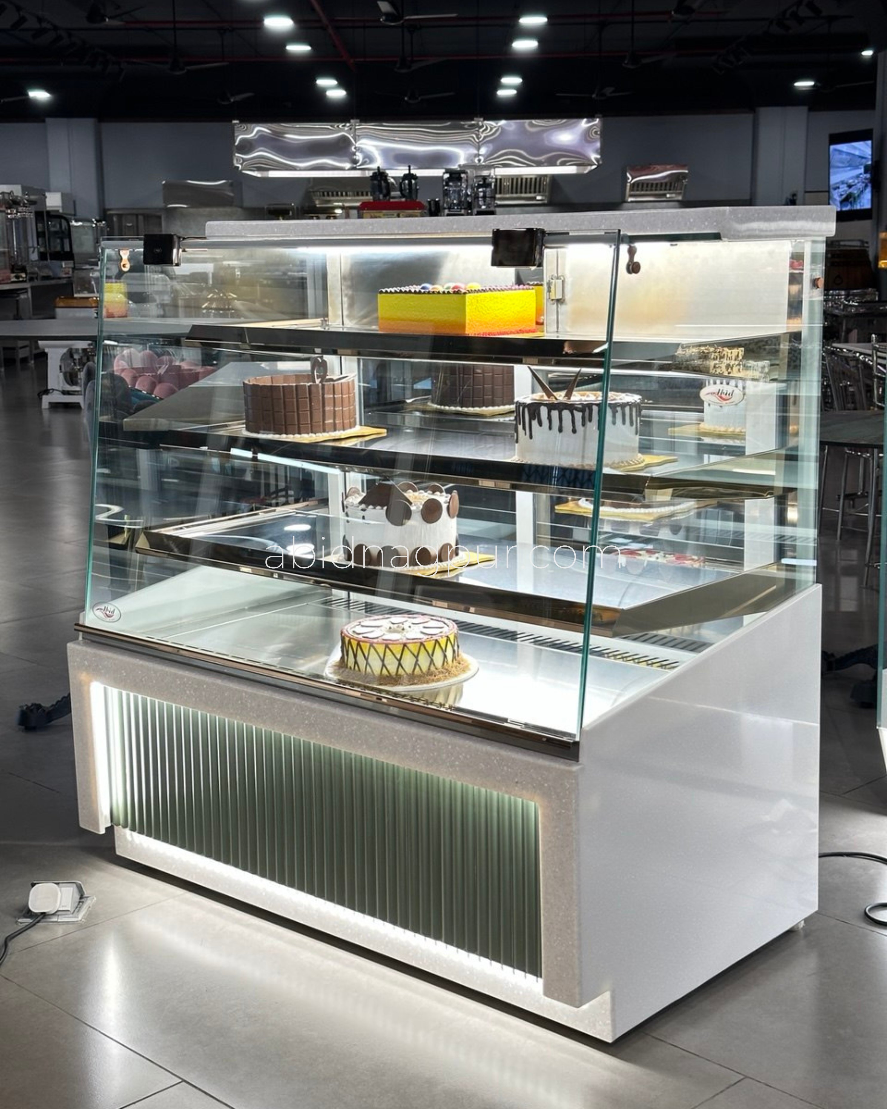 Abid Refrigeration Cake Display Counters are crafted using high-quality SS 304 food-grade stainless steel with elegant premium Corian work, offering superior durability, hygiene, and a luxurious finish for modern bakeries and dessert outlets. Designed for professional use, these refrigerated cake display counters feature uniform cooling and efficient air circulation to maintain the freshness, taste, and texture of cakes and pastries for longer hours, while clear glass panels and integrated LED lighting enhance product visibility and customer appeal. Ideal for bakeries, pastry shops, cafés, hotels, and cake showrooms, our counters are available in custom sizes and designs, combining energy-efficient performance with a premium look.