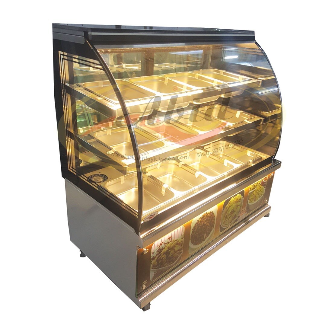 NAMKEEN FARSAN & COOKIES DISPLAY COUNTER C BEND GLASS REGULAR S.S MODEL 12 NAMKEEN FARSAN & COOKIES FLAVOUR CONTAINER OPERATING SYSTEM, TOP Z BLACK GRANITE SYSTEM, TOTAL S.S BODY 304 FOOD GRADE WITH ADJUSTABLE NYLON LUTCH.